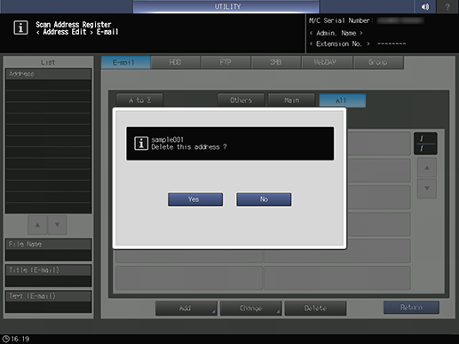 Control panel - Utility/Counter - [Administrator Setting] - [Scan Address Register] - [Address Edit] - [HDD] - Select a destination. - [Delete]