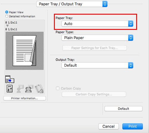 In [Paper Tray:] in [Paper Tray / Output Tray], select the paper tray for printing.