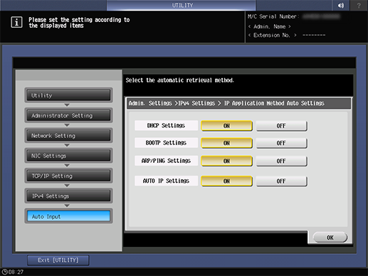 Screen access | Control panel - Utility/Counter - [Administrator Setting] - [Network Setting] - [NIC Settings] - [TCP/IP Settings] - [IPv4 Settings] - [Auto Input] | ||
