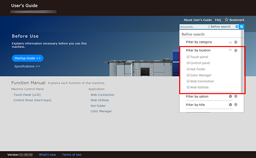 6 | [Filter by title] | Filters the search range by item title of the User's Guide. Clicking or tapping this item displays a modal window that enables you to select an item title. |