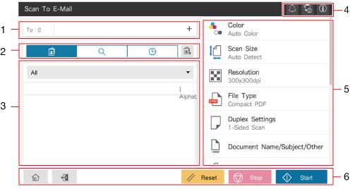 If you tap [Scan to Email] on the home screen, the main screen of Scan To E-mail is displayed.