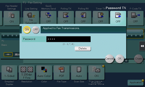 4. Tap [Application] - [Fax Setting] - [Password TX], and tap [ON].