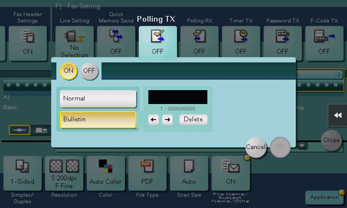[Bulletin] | Select this option to register a file for polling in the Bulletin Board User Box. Enter the User Box number of the Bulletin Board User Box you want to register. The Bulletin Board User Box can have only one file. You can create up to 10 Bulletin Board User Boxes. They can be used depending on the intended use. |