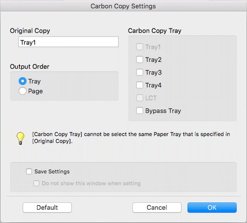 [Save Settings] | When the Save Setting check box is selected, the settings are saved. When the [Do not show this window when setting] check box is selected, this dialog box is not displayed when [Carbon Copy] is enabled. Using this function, you can save steps to configure settings the next time and after if you always specify the same carbon copy tray settings to execute a print job. |