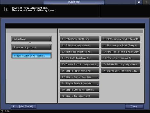 The screen returns to the Saddle Stitcher Adjustment Menu screen.