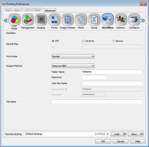 3. Click the Workflow tab, and then select Store on HDD in Output Method.