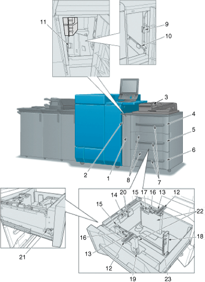 4 | Upper tray (Tray 1) | Holds 1,390 sheets (80 g/m2 / 21 lb Bond) of standard, custom, or tab paper sizes. Load paper of the weight from 52 g/m2 to 350 g/m2 / 14 lb Bond to 93 lb Bond. All types of paper can be loaded. |