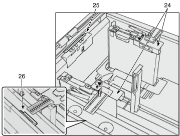 25 | Thick paper attachment | Mount this to load thick paper of 351 g/m2 to 400 g/m2 / 94 lb Bond to 106 lb Bond. This attachment can be mounted only in the lower tray. |