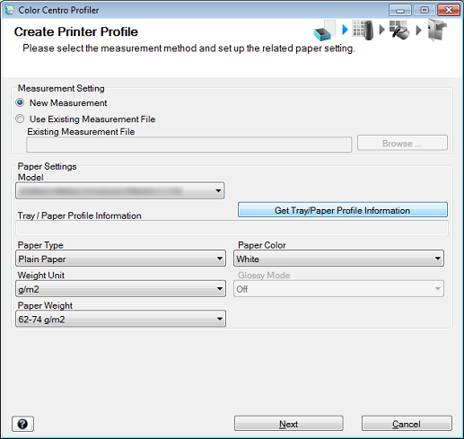 Select New Measurement under Measurement Setting and click Get Tray/Paper Profile Information.