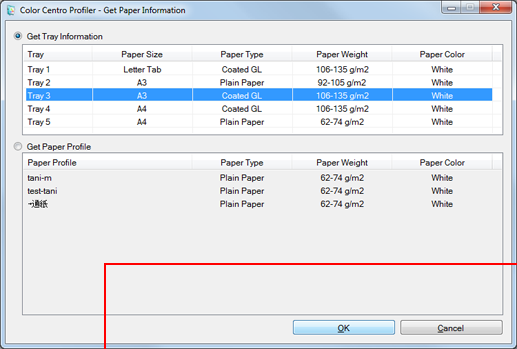 Example: Click Get Tray/Paper Profile Information so as to use the paper setting for Tray 3 (Coated GL: (A3) 128 g/m2 / 33 lb Bond).