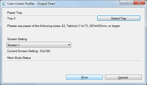 On the Output Chart screen, set the Paper Tray and Screen Setting. After setting, click Print.