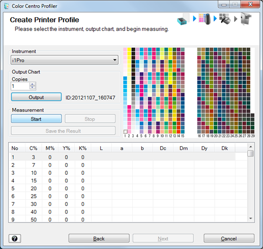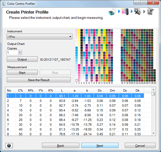 When the chart measurement is completed, the measurement result is displayed at the bottom of the Create Printer Profile screen.