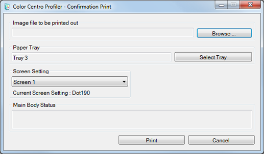 On the Confirmation Print screen, specify the image file to be printed, paper tray, and screen to be used. After setting, click Print.