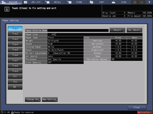 supplementary explanationThe screen provides Size, Name, Weight, Amount, Colored Paper, Punch, and Both Sides in a line for each tray. The Name normally shows a paper type, or a profile name if registered specifications are recalled.