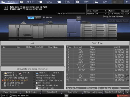When the fore-edge trimming scrap box of Saddle Stitcher SD-513 becomes full, the following message appears in the message area of the screen.