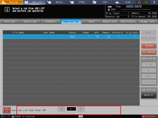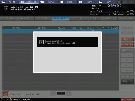 Save Job List then Power OFF at the bottom-left corner of the screen.