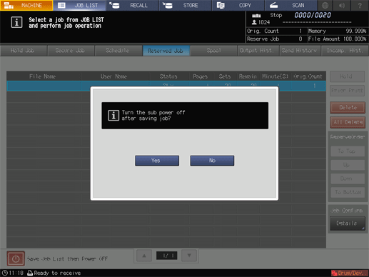 To continue the jobs, turn on the sub power switch to display the MACHINE screen, and then press Start on the control panel.