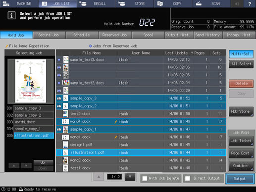 supplementary explanationIf a job that was moved from the reserved job exists, Jobs from Reserved Job is displayed in the top center of the list. Jobs moved from the reserved job cannot be stored on the HDD. For these jobs, a round blue icon