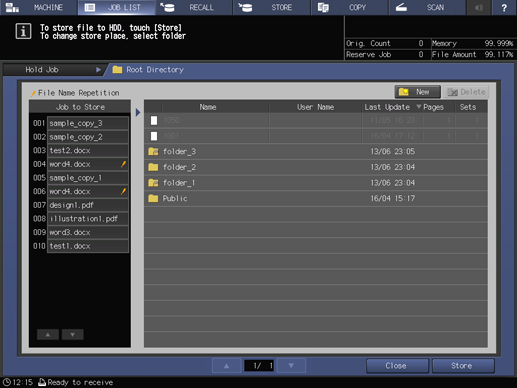 supplementary explanationYou can also create a new folder or user box to save the job. For details about how to create a folder and user box, refer to Folder and User Box.
