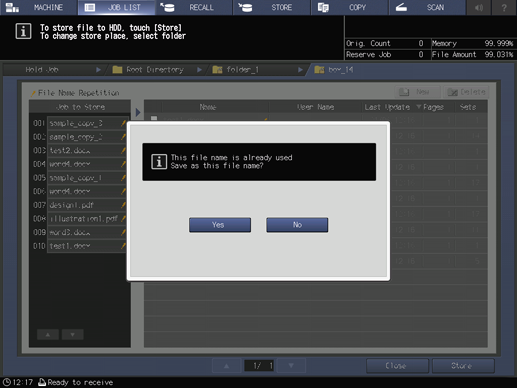 supplementary explanationIf the file name of the job has been duplicated, a confirmation dialog will be displayed. Press Yes to save it or press No to cancel.