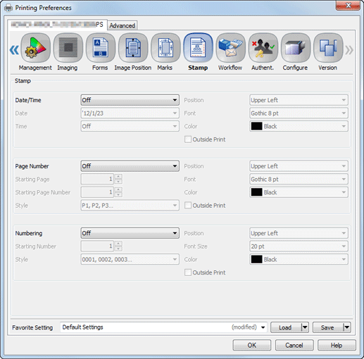 Outside Print | Off, On | Select this option to print Date/Time on the outside edges of facing pages. This function is available when Booklet or Adhesive Binding is selected in the Layout tab. | |