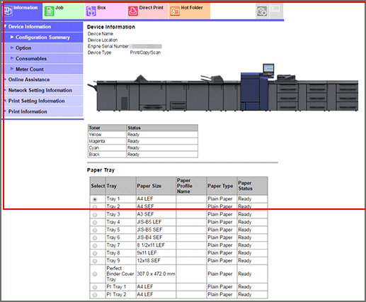 Device Information | Enables you to check the components, options, consumables, and meter counts of this machine. |