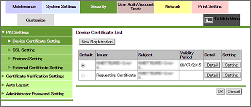 Click PKI Settings - Device Certificate Setting on the menu of Security tab to display this screen.
