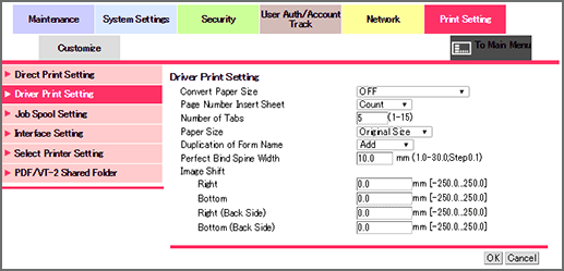 Click Driver Print Setting on the menu of Print Setting tab to display this screen. This setting can be made also from Controller on the MACHINE screen. For details about the setting, refer to [Driver Print Setting].
