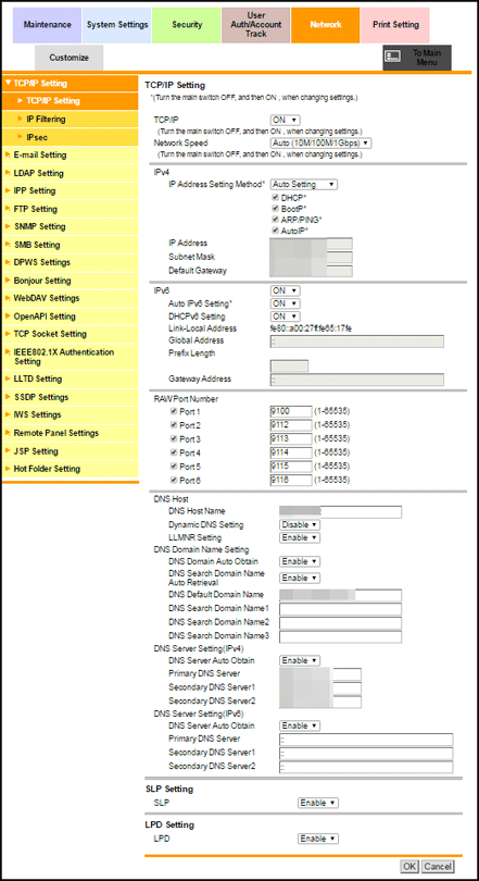 If you want to use host names for name resolution when accessing computers and servers on the network from the machine, configure DNS Server Setting (IPv4) and DNS Server Setting (IPv6) for IPv4 and IPv6 respectively.