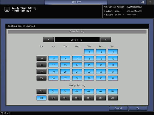 • supplementary explanationPress ON or OFF under the Daily Setting provided at the bottom of the screen to collectively set the ON/OFF condition for the entire month by the day of the week.