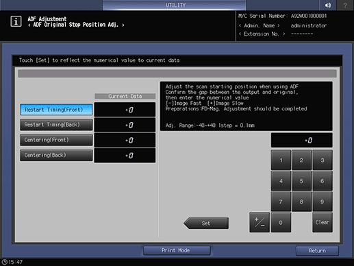 The ADF Original Stop Position Adj. screen is displayed.