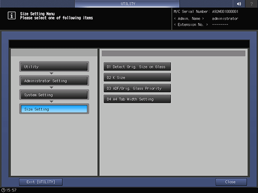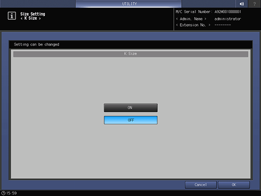 Press System Setting on the Administrator Setting Menu screen, and then press Size Setting and K Size in sequence.