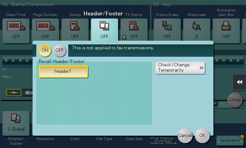 [Check/Change Temporarily] | If necessary, check or temporarily change the details of the program that is selected in [Recall Header/Footer].
