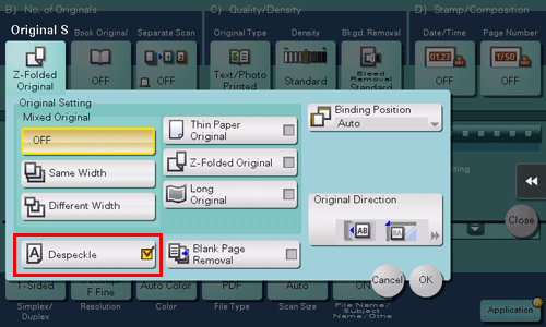 When [Despeckle] is specified to scan an original using the ADF, scanning of original and dust removal from the Slit Scan Glass are performed alternately, so that the original is always scanned using clean Slit Scan Glass.